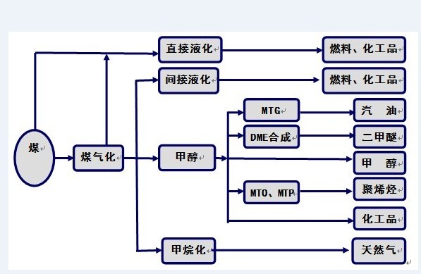 現(xiàn)代新型煤制油化工技術(shù)是以煤炭為基本原料,經(jīng)過(guò)氣化、合成、液化、熱解等煤炭利用的技術(shù)途徑,生產(chǎn)潔凈能源和大宗化工產(chǎn)品,如合成氣、天然氣、柴油、汽油、航空煤油、液化石油氣、聚乙烯、聚丙烯、甲醇、二甲醚等。改變傳統(tǒng)的煤炭燃燒、電石、煉焦等以高污染、低效率為特點(diǎn)的傳統(tǒng)利用方式。